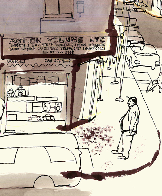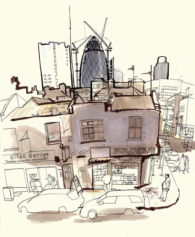 lucinda rogers drawing ink watercolour cityscape street scene london life construction gherkin rooftops skyline